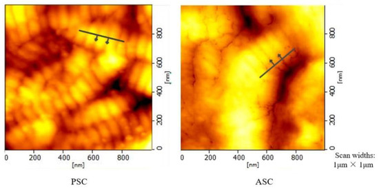In order to investigate well-characterized collagen, atomic force microscopy (AFM) was used in our study. AFM images of the collagen films were obtained in the air using a microscope. PSC and ASC were prepared with a thickness of 10 μm. The samples were mounted on AFM metal discs, while locator grids were used to map the surface so that the same area of collagen could be selected exactly. The topographic AFM images are presented on a color scale that represents the Z height. Observations from each sample were taken from several locations, but only the most representative are illustrated. The surface images used scan widths of 1 μm × 1 μm.