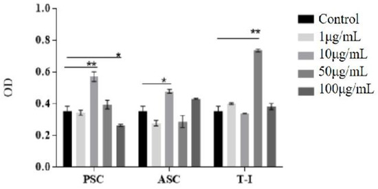 Viable cells OD at 570 nm of different concentrations of collagens (control: without collagen; PSC: tilapia PSC; ASC: tilapia ASC; T-I: bovine collagen). All values are mean + SD (n = 3). Different superscripts in the same column indicate significant differences compared with the control group (* p < 0.05; ** p < 0.01).