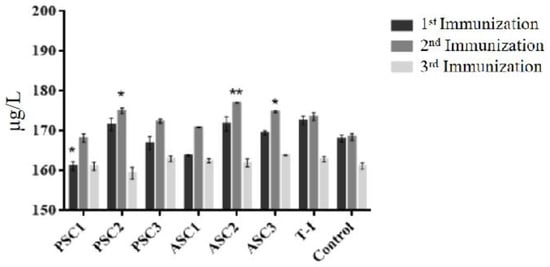 The mass concentration of tilapia collagen antibodies in mice. All values are mean + SD (n = 3). Different superscripts in the same column indicate significant differences compared with the control group (* p < 0.05; ** p < 0.01).
