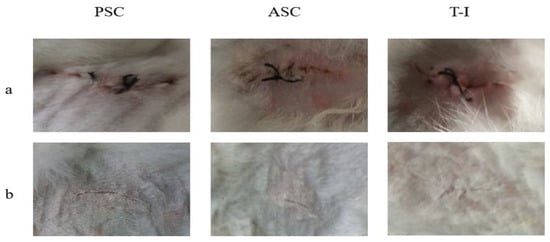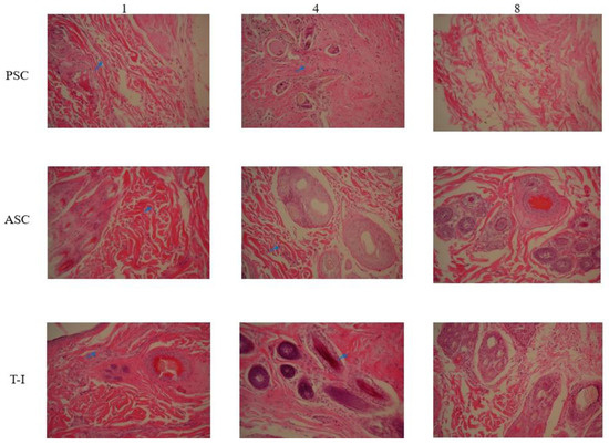 A histological analysis of the implantation experiment was performed using HE staining. From the histological evaluation (Figure 6), the collagens were completely degraded over 8 weeks without any foreign body reaction, which indicates acceptable biocompatibility and biodegradability. The degradation performed well, making it suitable for tissue engineering. The histopathological evaluation of the T-I group at 1 week and 4 weeks showed hemorrhages and inflammatory cell infiltrations (blue arrow). The tissue sections of the PSC and ASC groups showed a significant reduction in inflammatory cells in comparison to the T-I group at 8 weeks. Rejuvenation of skin appendages was evident at 8 weeks in all groups. The inflammatory reaction was significantly lower in the animals of all groups at 8 weeks in comparison to the groups at 1 week and 4 weeks. It seems that PSC and ASC showed better results when compared to the T-I group. All the treatments with collagen regimens significantly enhanced the fibrocytes (as the mature mesenchymal cells). Overall, the healing condition of the group treated with tilapia collagen was more similar to that of natural skin, and it had the best cosmetic appearance, with a normal thickness of the epidermal layer and rejuvenation of the hair follicles and skin appendages.