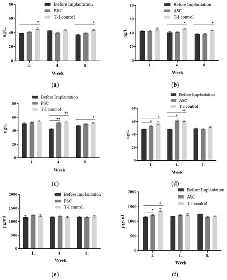 The levels of IL-4, IL-6, TGF-β, and TNF-α in the implantation experiment. (a) IL-4 content of PSC implantation; (b) IL-4 content of ASC implantation; (c) IL-6 content of PSC implantation; (d) IL-6 content of ASC implantation; (e) TGF-β content of PSC implantation; (f) TGF-β content of ASC implantation). All values are mean + SD (n = 3). Different superscripts in the same column indicate significant differences compared with the control group (* p < 0.05; ** p < 0.01).