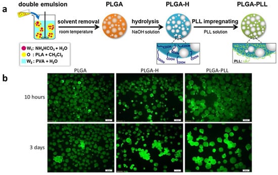 Yuan and coworkers prepared porous PLGA microspheres by a modified emulsion solvent evaporation method, and they subsequently functionalized the microspheres surface by hydrolysis (Figure 2). PLL was then utilized to modify porous PLGA microspheres using a simple dipping procedure to stimulate cell growth on them. Finally, modified PLGA microspheres were cultured in vitro to assess the impact of PLL coating on cytotoxicity, adhesion, and morphology [4] (Figure 2).
