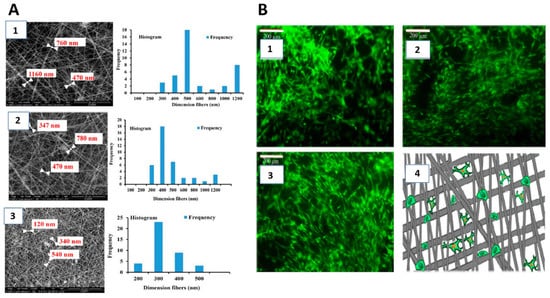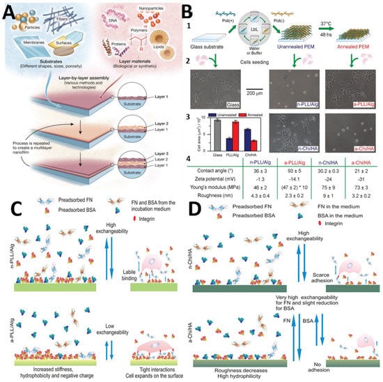 Muzzio et al. used the LbL technique to obtain a multilayer film by preparing a solution from poly-l-lysine (PLL) and sodium alginate (Alg), and another one from chitosan (Chi) and hyaluronic acid (HA) (Figure 4B). All polyelectrolyte solutions were prepared at a concentration of 1 mg/mL with the exception of PLL, which was prepared at 0.01 mg/mL. In order to maximize opposite charge interactions, a reorganization of the polyelectrolyte chains was induced by the annealing process.