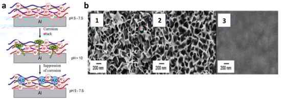 (a) Illustration of mechanism of buffering activity of polyelectrolyte coating. (b) The SEM images of the aluminum surface showing that when the number of polyelectrolyte multilayers increases, a homogeneous polyelectrolyte coating form. Reproduced with permission from Ref. [37]. Copyright 2008 The Royal Society of Chemistry.