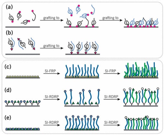 Illustration of different grafting synthetic routes. (a) Step-wise “grafting-to” of individual homopolymers, (b) “grafting-to” of Y-shaped diblock copolymers, (c) step-wise “grafting-from” via surface-initiated free-radical polymerization (SI-FRP) using non-selective initiators, (d) “grafting-from” via surface-initiated reversible-deactivation radical polymerization (SI-RDRP) using two disparate co-deposited initiators, and (e) “grafting-from” via SI-RDRP using Y-shaped bifunctional initiators. Reproduced with permission from Ref. [41]. Copyright 2020 Li and Pester under CC BY 4.0.