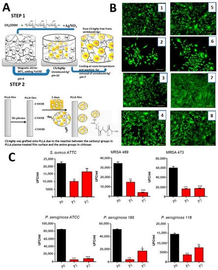 (A) Schematic representation of the two-step treatment. (B) Cell culture (cell line MC3T3-E1) after 48 h. (C) Strain adherence of S. aureus and P. aeruginosa (ATCC, clinical isolates) to polylactic acid films, *, ** and *** represents the magnitude of antimicrobial activity. Reproduced with permission from Ref. [73]. Copyright 2021 Aflori under CC BY 4.0.