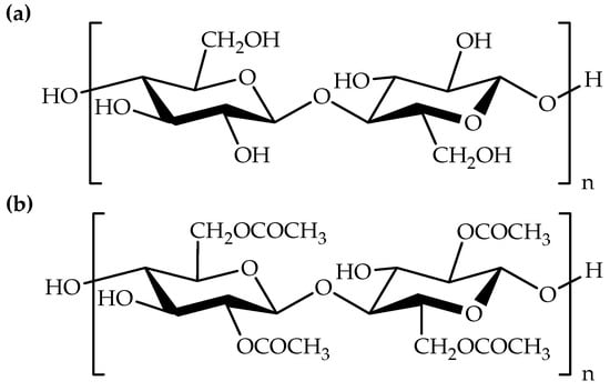 Recently, chitin, the second most abundant natural polymer after cellulose [1,29] has also been employed for the preparation of electrospun fibers. In addition, cellulose and chitin derivatives, such as cellulose acetate [24,25,26] and chitosan [12,30] were employed to prepare electrospun fibers. Both biodegradable polymer derivatives have good solubility with conventional organic solvents, compared to their neat polymers. Figure 1 exhibits the chemical structures of cellulose, cellulose acetate, chitin, and chitosan. Besides this, it can also be seen in Table 1 that synthetic biodegradable polymers, for example, polyhydroxybutyrate (PHB); polycaprolactone (PCL); polylactic acid (PLA); and polyvinyl alcohol (PVA) can be employed for the preparation of electrospun fibers [3,4,29,34]. Moreover, previous studies have shown that natural–synthetic polymer hybrid fibers have also been prepared via the electrospinning method [29,34]. Figure 2 displays the chemical structures of PHB, PCL, PLA, and PVA. In general, synthetic biodegradable polymer solutions can be easily prepared using organic solvents, such as chloroform, tetrahydrofuran, etc., prior to the electrospinning process. Additionally, fluorinated alcohol like 1,1,1,3,3,3-hexafluoropropanol can also be used as a solvent in the preparation of synthetic biodegradable polymer solutions. On top of that, carboxylic acids, such as formic acid and acetic acid have been used as low-toxicity solvents for the electrospinning of natural biodegradable polymers [31].