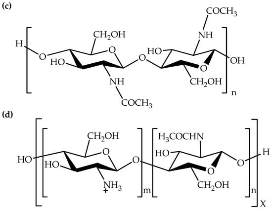 Chemical structures of (a) cellulose, (b) cellulose acetate, (c) chitin, and (d) chitosan.