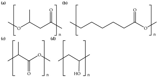 Chemical structures of (a) PHB, (b) PCL, (c) PLA, and (d) PVA.