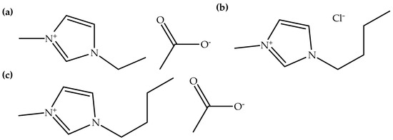 Chemical structures of (a) [C2mim][OAc], (b) [C4mim][Cl], and (c) [C4mim][OAc].