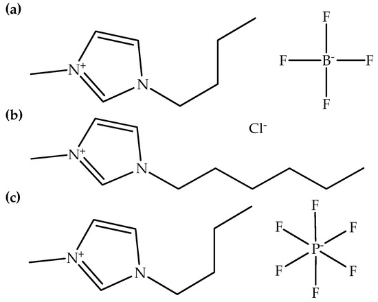 Chemical structures of (a) [C4mim][BF4], (b) [C6mim][Cl], and (c) [C4mim][PF6].