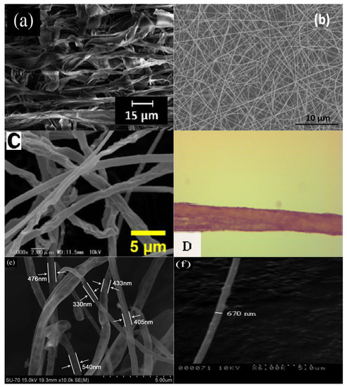 SEM micrographs of (a) electrospun cellulose fibers [6]; (b) electrospun silk fibers [36]; (c) electrospun cellulose fibers [14]; (d) electrospun chitin/PLA blend fiber [29]; (e) electrospun cellulose fibers [7]; and (f) electrospun chitin fiber [1] assisted by different ionic liquids as solvents.