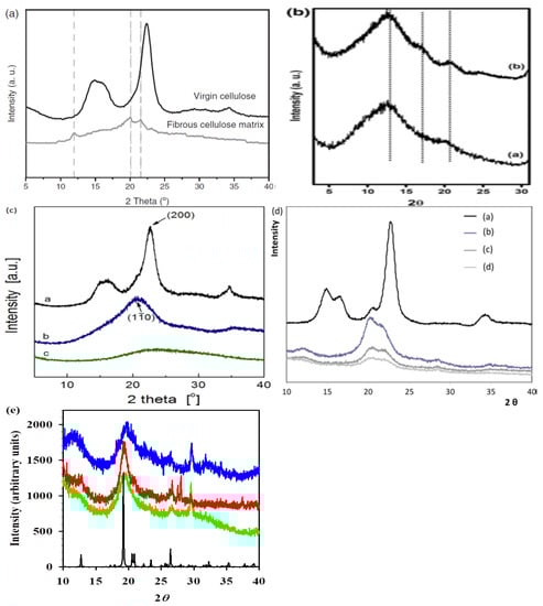 XRD patterns of (a) electrospun cellulose fibers (bottom) [6]; (b) electrospun silk fibers (top) [36]; (c) electrospun cellulose fibers (bottom) [14]; (d) electrospun cellulose fibers (middle c) [7]; and (e) electrospun chitin fibers (top) [1] assisted by different ionic liquids as solvents.