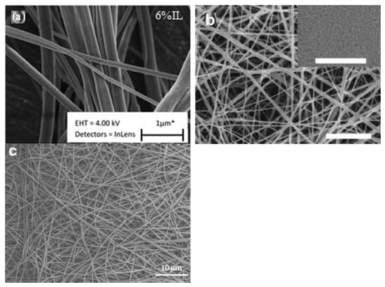 SEM micrographs of (a) electrospun cellulose acetate fibers [25]; (b) electrospun PLA fibers [39]; and (c) electrospun gelatin fibers [33] assisted by different ionic liquids as additives.
