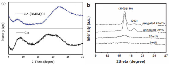 Table 8 illustrates the properties of electrospun biodegradable polymer fibers that are assisted by ionic liquids as additives. The electrospun cellulose acetate fibers were prepared by Javed et al. from cellulose acetate powder using [C4mim][Cl] as an additive [25,26]. The morphological, chemical, crystalline, and thermal properties of the prepared electrospun fibers were characterized by a scanning electron microscope, Fourier transform infrared spectrometer, X-ray diffractometer, and thermal gravimetric analyzer. The morphological property, such as the average thickness of the electrospun cellulose acetate-[C4mim][Cl] fibers increased by up to 525 nm with an addition of 6% of [C4mim][Cl] (Figure 7a), compared to the electrospun cellulose acetate fibers (125 nm). This was attributed to the lower viscoelastic force that was created by reducing the concentration of [C4mim][Cl] during the electrospinning process, which reduced the stretching force. Besides this, the chemical property, such as the infrared characteristic bands of the electrospun cellulose acetate-[C4mim][Cl] fibers shifted to higher wavenumbers in comparison to the electrospun cellulose acetate fibers. This suggested that the cations and anions of [C4mim][Cl] formed hydrogen bonding with cellulose acetate [25]. However, the crystalline property, such as the intensity of the X-ray diffraction peak of the electrospun cellulose acetate-[C4mim][Cl] fibers considerably decreased, compared to the electrospun cellulose acetate fibers (Figure 8a). This implied a reduction in crystallinity because of the disruption of the molecular packing of the cellulose acetate by [C4mim][Cl]. Moreover, the thermal property, such as the decomposition temperature of the electrospun cellulose acetate-[C4mim][Cl] fibers is lower than the electrospun cellulose acetate fibers. This demonstrated that the electrospun cellulose acetate-[C4mim][Cl] fibers have less thermal stability [26]. Therefore, it can be concluded that the addition of [C4mim][Cl] into cellulose acetate provides electrospun fibers with low crystallinity and low thermal stability.