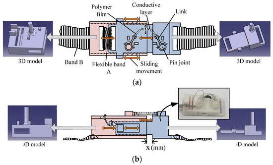 Because the band connecting the two mechanical parts in the sensor module (band A, Figure 2a) exhibits lower elasticity than the band connecting the sensor modules (band B, Figure 2a), the protrusions and depressions can be effectively detected by the sensor module.