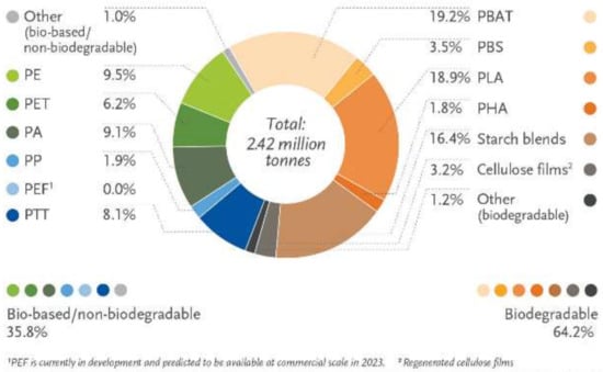 The global production of bioplastics by material types. Copyright European Bioplastics Nova-Institute (2021). Available online: https://www.european-bioplastics.org/news/publications/#MarketData (accessed on 1 June 2022).