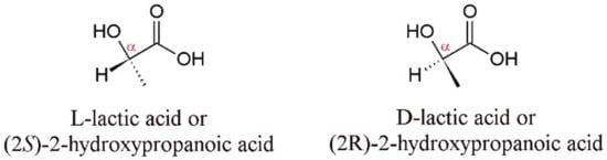 One of the main bio-based polymers currently produced is PLA—polylactide or poly(lactic acid)—which is a lactic acid-based polymer that stands out as a potential replacement for some highly consumed thermoplastic polymers, such as PET (polyethylene terephthalate) and PS (polystyrene) [,,]. The PLA building block is lactic acid and lactide. Lactic acid (2-hydroxypropanoic acid) is one of the simplest chiral organic molecules known. It was discovered in 1780 by the Swedish chemist Scheele, and it can be produced chemically or biologically, in two isomeric forms: D-lactic acid (R, (−)-lactic acid) and L-lactic acid (S, (+)-lactic acid, in addition to the racemic mixture, commonly called D,L-lactic acid [,,]. It belongs to the class of α-hydroxy acids, which are weak organic acids with one or more hydroxyl groups attached to the alpha carbon, which is the first after the acid group [,], as shown in Figure 2. Lactic acid, as well as many other hydroxy acids, is often in high demand in pharmaceutical, food, and biomedical applications, acting as a food additive, preservative, acidulant, cosmetic, personal care product and the building block of bio-based polymers [,,], in addition to playing a vital role in the glycolytic energy cycle [,,]. The bifunctionality of lactic acid, conferred by the alcohol and carboxylic acid groups, makes this molecule susceptible to different reactions, such as condensation, reduction, esterification, and substitution in the alcohol group, and considerably expands its applications [].