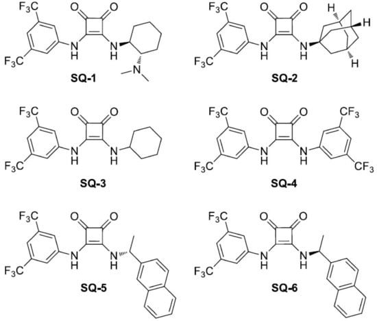 Jiang et al., prepared stereoselective ROP of rac-LA at room temperature using squaramide-based catalysts, which are part of the efforts toward the development of metal-free catalysts [] for this reaction. The authors explored the catalytic properties of a series squaramide-based catalysts containing chiral or bulky substitutes, respectively (Figure 4). The structure SQ-1 was inspired by the thiourea-amine catalyst and its activity was analyzed in different solvents, being rather low in THF and toluene but much faster in dichloromethane (DCM), with 51% monomer conversion in 24 h to generate PLA (rac-LA/SQ-1/BnOH = 100/5/1, Mn (obtained by GPC) = 5.9 kDa; dispersity (D) = 1.08, and parameter by enantiomorphic site control method (ESC), Pi = 0.88). Probably, DCM had better solubility towards catalyst and PLA at room temperature. PLA polymer showed a melting temperature of 153 °C, indicating its semi-crystalline character. After polymerizing for 72 h under the same condition, the monomer conversion was increased to 95% and the isotacticity of the resulting PLA remained at the same level, i.e., Mn (GPC) = 11.5 kDa, D = 1.38, Pi (ESC) = 0.85. When the SQ-1 increased from 5 to 10 mol%, monomer conversion increased to 88% in 24 h, but the stereoselectivity of the polymerization did not drop when it happened (Mn, GPC) = 12.1 kDa, D = 1.08, Pi (ESC) = 0.85. The bifunctional catalyst SQ-1 presented the ROP of rac-LA with high controllability but low activity. Thus, the authors used a binary catalytic system containing squaramide and a stronger organic base to make the polymerization more efficient (SQ-2 to SQ-6 and 1,8-diazabicyclo[5.4.0]undec-7-ene (DBU)). This binary system promoted the polymerization reaction at room temperature within a short reaction time, among which SQ-2 exhibited the best stereoselectivity without transesterification side reactions during the process.