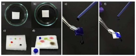 (a) Pristine melamine (PM), (b) PCL/PDLLA (80:20) melamine sorbent, oil and water absorption of (c) pristine melamine and (d) PCL/PDLLA (80:20) (bluewater, red-hexane, maroon-octane, dark yellow-soybean oil, light yellow-motor oil, green-petroleum ether, and black crude oil). Water absorption of (e) pristine melamine and (f) PCL/PDLLA (80:20). Obtained from reference []. Copyright @ 2021 Elsevier, License Number: 5303800945222.