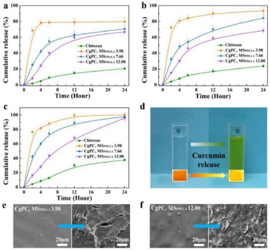 Drug release from chitosan and CgPC films in PBS (a), lysozyme (b) and porcine pancreas lipase (c). Color changes of the medium and film after curcumin release (d). SEM images of curcumin-loaded CgPC films (MS-PDLLA 3.98) before and after drug release in porcine pancreas lipase (e). SEM images of curcumin-loaded CgPC films (MS-PDLLA 12.00) before and after drug release in porcine pancreas lipase (f). Obtained from reference []. Copyright @ 2021 Elsevier, License Number: 5305970853110.