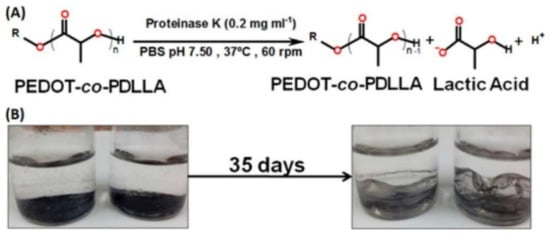 (A) Biodegradation Reaction and (B) Physical Aspects of PEDOT-co-PDLLA Films before and after 35 Days of Biodegradation Assay. Obtained from reference []. Copyright @ 2018, The Authors, ACS.