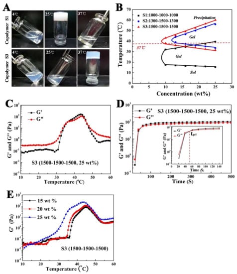 The thermogelling behavior assay and rheological analysis of the obtained. PDLLA-PEG-PDLLA hydrogel. (A) Photographs of the copolymer solutions at different temperatures. Copolymer L1000–E1000–L1000 (S1, 25 wt.%) gelates between 4 °C and room temperature and precipitated around 37 °C. Copolymer L1500–E1500–L1500 (S3, 25 wt.%) exhibited a sol at 4 °C and room temperature, and gelated around body temperature. (B) Sol–gel phase transition diagram of the hydrogel tested by the tube-inverting method. (C) Temperature dependence of storage (G’) and loss modulus (G”) for the copolymer aqueous solution (S3, 25 wt.%) as a function of temperature. (D) Gelation times of the copolymer solutions (S3, 25 wt.%) at 37 °C. (E) Change in G’ of the copolymer solutions at different concentrations (S3, 15 wt.%, 20 wt.%, 25 wt.%) as a function of temperature. Obtained from reference []. Copyright © 2022, The Authors, Springer Nature.
