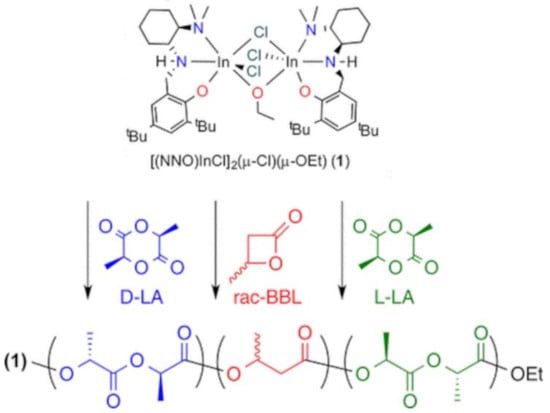 Aluthge et al., reported a sequential monomer addition method to prepare a series of triblock copolymers of PLA and poly(hydroxybutyrate) (PHB), and copolymers PLLA-PDLLA-PLLA and PLLA-PDLLA-PDLA []. The authors used ROP of cyclic esters lactide (LA) and β-butyrolactone (BBL) with a diaminophenoxy (NNO) supported dinuclear indium catalyst ([(NNO)InCl]2(μ-OEt)(μ-Cl)). The authors present the synthesis of nearly monodispersed diblock copolymers of DL-LA or D-LA with L-LA by ROP (Figure 10). The results indicated the stereocomplex formation of these copolymers with influence on their rheological and mechanical properties. The inclusion of PHB in the middle of the block provided more elastomeric nature (i.e., solid-like behavior), whereas the rheological properties of PLLA-PDLLA-PDLA and PLLA-PDLLA-PLLA blocks were comparable to those of pure PLLA, PLDA or their blends.