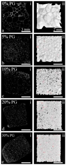 Li et al. [] prepared composite scaffolds of commercial PDLLA (MW = 72 kDa, Institute of Medical Device, Beijing, China;) with bioactive wollastonite (prepared by chemical coprecipitation method) by the conventional solvent casting-particulate leaching method []. The authors verified that the scaffolds were bioactive and showed the ability to compensate for the pH decrease caused by the acidic degradation of PDLLA by-products. Furthermore, the hydrophilicity of the pure PDLLA was improved by adding wollastonite. The authors were able to prepare crystalline polymer foams and control porosity and surface/volume ratio with an open-cell morphology. They prepared membranes of porosity as high as 0.93, showing that this method was capable of the preparation of highly porous polymers.