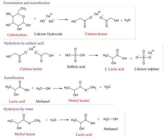 Currently, about 90% of the lactic acid marketed worldwide is obtained via microbial fermentation of first-generation biomass sugars, such as corn starch and sugarcane broth [,]. These agricultural products are converted into lactic acid by the action of lactic acid bacteria (LAB) that can produce the enantiopure L-lactic and D-lactic acid, or even D,L-lactic acid, as is the case with Lactobacillus helveticus [,]. Presently, all commercialized processes for the production of lactic acid depend on refined carbohydrates, such as glucose, lactose-containing whey and sucrose from sugarcane and beetroot [,]. The use of these refined carbohydrates, however, results in higher production costs, motivating the search for lower-cost substrates such as lignocellulosic biomass, seaweeds, domestic organic waste (e.g., food waste) and residues from the dairy industries [,,,,,]. Microbial fermentation of carbohydrates is more economically viable than chemical synthesis, with carbohydrates being converted to lactic acid in batch reactors using water and bacterial cultures in a broth-like mixture. This broth, having calcium lactate and other impurities, undergoes filtration, carbon treatment, evaporation and acidification with sulfuric acid to remove cells and obtain lactic acid and calcium sulfate. As calcium sulfate is insoluble, it is removed by filtration, and lactic acid is hydrolyzed, esterified, distilled and hydrolyzed []. Scheme 1 shows the sequence of the main steps involved in a conventional lactic acid fermentation process, as described in literature [].
