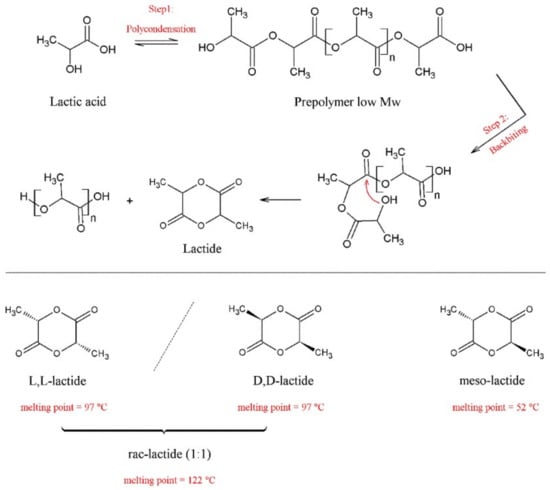 Lactide is the cyclic dimer of lactic acid and the most important building block in the production of PLA [,]. The lactide has two stereocenters, which can both have the same configuration, in the case of L,L-lactide and D,D-lactide, or both with different configurations, in the case of meso-lactide. In addition to these diastereomers, there is also the possibility of obtaining racemic lactide (rac-lactide), which consists of a 1:1 mixture of L,L-lactide and D,D-lactide [,,,,,]. The melting point of meso-lactide is significantly lower than that of enantiopure lactides and rac-lactide (122, 97 and 52 °C, respectively), which makes it possible to isolate it from the other isomers by distillation or crystallization techniques [,,]. The conventional synthesis of lactide takes place in a two-step process that consists of the polymerization of lactic acid by polycondensation and depolymerization of this polymeric species to obtain the lactide (Scheme 2). The polycondensation step is usually carried out under vacuum and at high temperature to ensure the removal of water from the system and the condensation of lactic acid molecules, leading to the formation of short-chain oligomers and low relative molar mass (<5 kDa). The backbiting step, which is an endothermic transesterification reaction [,,], occurs in the presence of a metallic catalyst, normally a soluble salt based on tin, zinc, antimony, aluminum, etc. forming oligomers and lactide under reduced pressure [,]. As lactide is formed together with oligomeric fractions of lactic acid, it needs to be continuously removed from the reaction medium during synthesis, through successive distillation techniques using, for example, azeotropic solvents which makes the process even more expensive []. It is estimated that about 30% of the total cost associated with the production of PLA comes from the synthesis of lactide [].