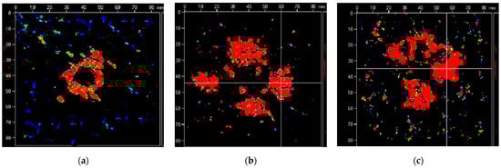 As the composite laminate is damaged by pulling, the failure mode of the hole edge is fuzzy, and the vidual defects are not very distinct from each other. Therefore, it needs to be observed by non-destructive testing equipment. In this test, the ultrasonic characteristic scanning imaging system (UTF-SCAN-1 Water immersion C-scan detection system) performs non-destructive testing on the damaged specimens. The location, size, and damage plan of the damaged area of the laminate can be obtained by ultrasonic C-scanning. The C-scan non-destructive testing test is carried out on the test pieces of different thicknesses after the pull-off test, and the damage of each layer of the test pieces with different thicknesses, area, and depth is obtained. As shown in Figure 6a–c above, the maximum failure surface of the specimen with a thickness of 1.25 mm is located in the lower layer of the laminate, that is, the fourth layer (90-degree direction), and the specimen with a thickness of 3.25 mm has the largest failure surface, while the failure surface is located in the middle layer of the laminate, that is, the ninth layer (90-degree direction). The maximum failure surface of the specimen with a thickness of 5.10 mm is located in the upper layer of the laminate, that is, the seventh layer (0-degree direction). It can be seen that with the increase in the thickness of the specimen, the position of the maximum failure surface of the specimen moves along the thickness direction from the upper layer position (including the straight hole surface) of the laminate to the lower layer position (including the countersunk hole surface).