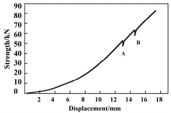 After, respectively, exploring the axial tensile properties of composite materials and threaded composite materials, the rear joint of RS03A composite material is selected for thread tensile testing. The load–displacement curve during the tensile process is shown in Figure 7. As can be seen from Figure 7, when the load is applied to a certain level (point A in Figure 7), it will suddenly drop, and the composite material will emit a crisp sound during the experiment; the load at this time is defined as the initial failure load [26]. As the displacement increases, the load continues to increment, and the sound continues to appear during the period until the last loud sound. The cylinder composite material breaks as a whole, and the maximum load at this time is the breaking load. The initial failure load and fracture load are used to calculate the stresses, which are recorded as the initial failure stress ( σ 1 ) and the final failure stress ( σ 2 ).