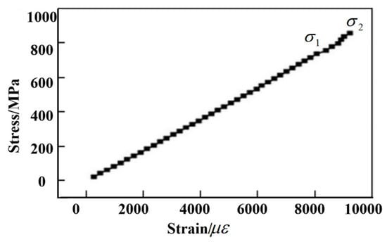 The stress–strain curve of axial tension is shown in Figure 8. It can be seen that the axial tensile modulus of the composite samples is relatively stable, with an average value of about 90 GPa. The average initial failure stress is about 470 MPa, and the final failure stress average is about 800 MPa. Shown in Figure 9 is the photo of the composite material after fracture. It can be seen from the figure that when the composite material is finally damaged, the fiber is fractured. At the same time, it can be seen that the fiber layer also cracks many times during the fracture. The final breaking load of the composite material is caused by the fracture of the helical fiber as the main force carrier. When the first load occurs, the hoop layer composite material has already cracked. At this time, its initial failure stress is about 470 MPa, and the axial tensile fracture strain is about 0.5%, manifesting that the decrease in the first load force in value is due to the failure of the composite laminate reaching the breaking strain. In the actual working conditions of the composite material used in this experiment, if cracking occurs, it signifies a functional failure. Therefore, the initial failure stress when the load decreases for the first time is used as the criterion for judging whether the composite material fails.