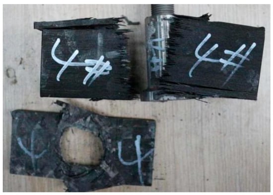 At the beginning of the experiment, the appearance of the laminate basically does not change, and the stress–strain curve shows a linear rise. When the strain reaches 4500 μ ε , the edge of the hole in contact between the laminate and the adapter begins to have a small fiber uplift, and there is a clear and crisp squeak, indicating that the laminate begins to damage. As the displacement continues to increase, the area of the uplifted fiber increases slowly, and the damage range expands from the center of the circular hole to the edge of the laminate, and some fibers are pulled off at the edge of the hole. The load drops slightly, the curve of the increase in stress continues to rise slowly. As the load continues to drop, it is accompanied by a continuous brittle sound. Finally, the “explosion” is carried out in the “middle section” of the failure mode until the laminated plate is completely destroyed. Fiber fracture, delamination, fiber pull, and debonding are found at all locations, indicating that the matrix and interface are severely damaged during loading.