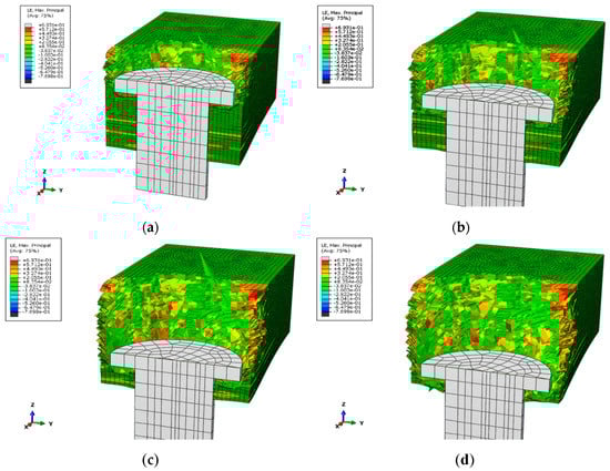 Figure 10. Matrix tensile damage distribution under load of different percentage: (a) load intensity 5 × 10−2 to 25 × 10−2, (b) load intensity 25 × 10−2 to 50 × 102, (c) load intensity 50 × 10−2 to 75 × 10−2, (d) load intensity 75 × 10−2 to 100 × 10−2.