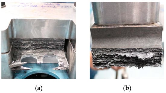 Due to the continuous loading of the equipment, the laminate will slowly deform and fail as the loading strength of the jack increases. The central loading area of the laminate beam is subject to the maximum stress due to bending/tensioning [31,32]. Being exposed to the action of incident compressive stress waves and bending waves, the threads will form lateral deformations and localized wrinkles at the edges in contact with the laminate beams. The compressive stress wave is reflected by the backside of the laminate to form a tensile wave. When the tensile wave intensity is large enough, the laminate will undergo spalling between the fiber and the matrix. Under sufficient loading strength, with the increase in transverse deformation and axial tensile, the fracture failure of the matrix and fibers occurs in the laminate.