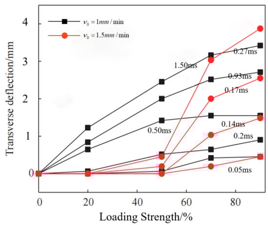 Figure 12 compares the deformation profile with time and strength at 50% and 100%, showing the obvious localization of deformation. When the loading strength is between 5% and 50%, and the velocity is 1.5 mm/min, the two sides of the laminate always slip along the radial direction without lateral deformation. However, when the velocity is set at 1 mm/min, the transverse defection will move sharply. When the loading percentage is 40–50%, the deformation gradually diminishes. With the increment of structural deformation, the target plate finally leaves the fixture and continues to move with a certain kinetic energy. When the loading percentage is greater than 50%, the laminate mainly undergoes elastic deformation, and no obvious failure occurs on the surface of the laminate. When the loading percentage reaches 60%, the laminate fails with the increase in tensile strength. The laminate is completely broken when the load reaches 90%.