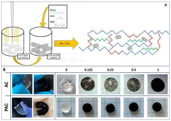 Panel (A): schematical depiction of the synthesis process of the polyacrylamide-based hydrogels reinforced with Ag-decorated CNTs; Panel (B): digital images of the obtained hydrogels at hydration equilibrium.