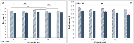 Gel fraction (A) and swelling degree (B) values computed for the AC (patterned columns) and PAC (full color columns) series. Statistical significance: ^^, ** p < 0.01, ^^^ p < 0.001, ns—not statistically significant.