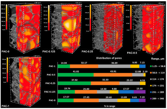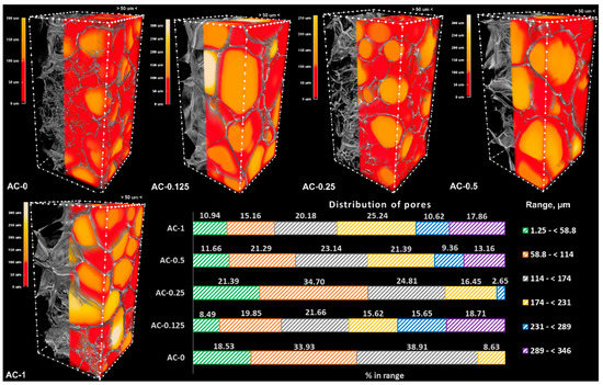 As depicted in Figure 3, the control sample (AC-0) is lacking pores greater than 231 µm, with most of them (over 52%) being in the range of 1.25–114 µm. The addition of nanoparticles in the system leads to an increase in the pores’ dimensions and to the appearance of larger ones, with dimensions in the interval 231–346 µm; the sample with the highest content of CNTs has the majority of pores (53.72%) in the interval 174–346 µm.