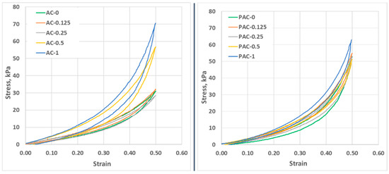 The fatigue resistance of the materials was evaluated through cyclic loading–unloading tests performed in a quasi-static manner at a low compression speed (0.1 mm/s). As depicted in Figure 5, all samples exhibited good elasticity, as the stress decreased gradually after load removal. There were notable differences between the AC and PAC samples. Firstly, in the case of the AC series, hysteresis may be observed even at low strain values (strain 0.5), especially above a 0.5% filling ratio (wt., CNT:AAm), while in the case of PAC samples, hysteresis may be observed at slightly higher values. Even more, the hysteresis of the PAC samples is lower when compared to the values computed for the AC series (Table 3). In the first compression cycle, there are no notable differences between the hysteresis values of the neat hydrogels of the two series (11.55% for AC-0 and 11.37% for PAC). The hysteresis of the neat hydrogels is significantly altered by the addition of nanoparticles in both series. For the AC series, the hysteresis of the low-loading composites (AC-0.125 and AC-0.25) is smaller, while for the compositions with 0.5% and 1% filling ratios (AC-0.5 and AC-1, respectively), it is higher than the neat hydrogel. AC-0.5 and AC-1 behave quite differently under stress compared to the rest of the compositions of the same series, even at 10% deformation, as depicted in Figure 5. The plotted strain–stress curves show that when AC-0.5 and AC-1 are considerably stiffer, requiring increased stress to reach the same deformation as the rest of the hydrogels, the stress–strain curves registered for the other two composites are similar to the ones registered for the neat hydrogel. This behavior indicates that the minimum ratio of CNTs that has a significant impact on the mechanical properties of the AC hydrogels is 0.5% (wt.) CNT:AAm.