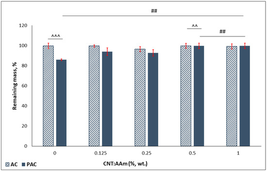 The stability of purified samples was investigated following incubation for 28 days in PBS, at 37 °C. The remaining mass (RM, %) was computed, and the results are depicted in Figure 6 as bar charts. The AC series is highly stable, with no mass loss. Figure 6 indicates that the presence of linear PAAm reduces the stability of the purified scaffolds, with the strongest effect (statistically significant) recorded for the sample without nanoparticles (PAC-0 registered the highest mass loss, around 14%). The lower values of the RM for the PAC series may be attributed to the solubilization of the linear polymer, immobilized in the 3D polymeric network. The lower values of mass loss (below 10%) recorded for the CNTs-loaded samples indicate that the presence of the nanospecies stabilizes the compositions.
