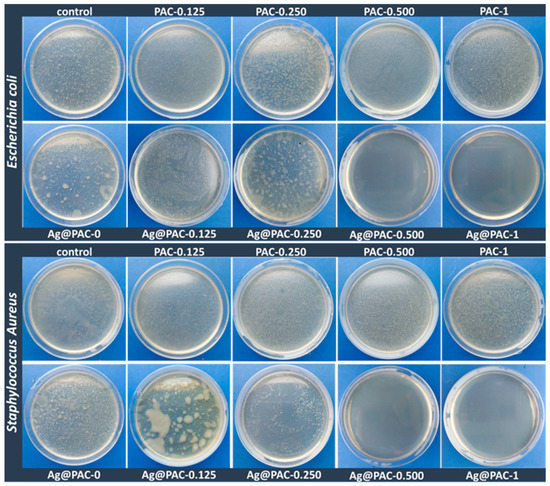 The antimicrobial activity of the PAC materials was assessed using silver decorated CNTs (Ag@CNTs) as fillers, while maintaining the synthesis protocol, as previously described. The ratio Ag:CNT was maintained 1:100 in all samples, resulting in a maximum of 78.4 × 10−4% wt./wt. in PAC-1 and half that amount in PAC-0.5. The registered results (Figure 7 and Table 4) show an efficiency of over 95% for Ag@PAC-0.5 and Ag@PAC-1 when tested against the Gram-negative bacteria (E. coli). Better results were obtained in the case of Gram-positive bacteria (S. aureus), where a Ag@CNT loading ratio of only 0.25% (wt.) with respect to AAm was sufficient for a 50% efficiency. Higher Ag@CNT loading led to higher antimicrobial efficiencies of 98% (for Ag@PAC-0.5) and 100% (for Ag@PAC-1).