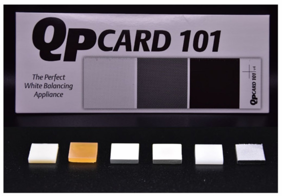 Six different substrates (abutment materials) (Table 1) and a gray background were considered for this experiment. The substrates included two dental 3D printing resins (CR and MR), two semicrystalline thermoplastic polymers (PEEK and PEKK), one zirconia polycrystal, and one cobalt–chromium alloy. All substrates were designed with 10 × 10 mm size and 2 mm thickness via Solid-Works software (Dassault Systèmes SolidWorks, Waltham, MA, USA). Dental resins were 3D printed by Phrozen Sonic XL 4K (Phrozen Tech Co., Ltd., Hsinchu, Taiwan). The thermoplastic polymers and zirconia polycrystals were fabricated using milling by a dental CAD/CAM system (Cameo 250i; Aidite Technology Co., Ltd., Qin Huang Dao, China). The Co–Cr alloy was 3D printed by Riton Laser D-100 (Rxton Technology Co., Ltd., Guangzhou, China). A standardized professional photography card (QP Card 101; QPcard AB, Göteborg, Sweden) was used for the gray background.