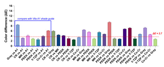 Pairwise comparison of the color difference (ΔE) of M-Zr samples measured under different substrates. Blue box represented the ΔE compared with the Vita A1 Shade guide (L* = 76.7, a*= 1.1, and b* = 14.7). Horizontal dotted line represents clinical indicators of ΔE = 3.7 [33].