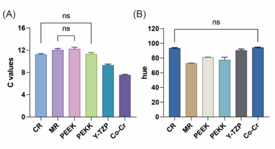 Results of average (A) chroma (C) values and (B) hue (h) under different substrate groups. No statistical differences between groups are shown as “ns”.