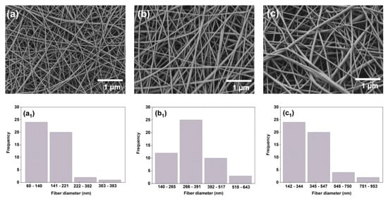SEM images showing the morphology and the fiber diameter distribution of (a) PCL/GEL, (b) PCL/GEL/0.18%PE, and (c) PCL/GEL/0.36%PE electrospun nanofibers. The pore size distribution in each case was determined by ImageJ software and is shown at the bottom of the plots: (a1): PCL/GEL, (b1): PCL/GEL/0.18%PE, and (c1): PCL/GEL/0.36%PE electrospun nanofibers.