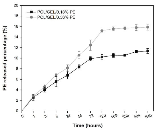 Release profiles over time of PE from PCL/GEL electrospun nanofibers immersed in PBS (pH = 7.4, 37 °C).