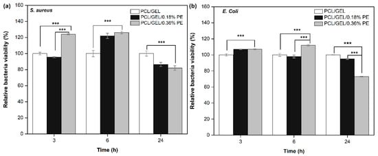 Antibacterial activity of PCL/GEL, PCL/GEL/0.18%PE, and PCL/GEL/0.36%PE electrospun nanofibers after 3, 6, and 24 h of incubation period: (a) S. aureus bacteria and (b) E. coli bacteria (Duncan test by one-way ANOVA analysis, n = 3, *** p < 0.001).